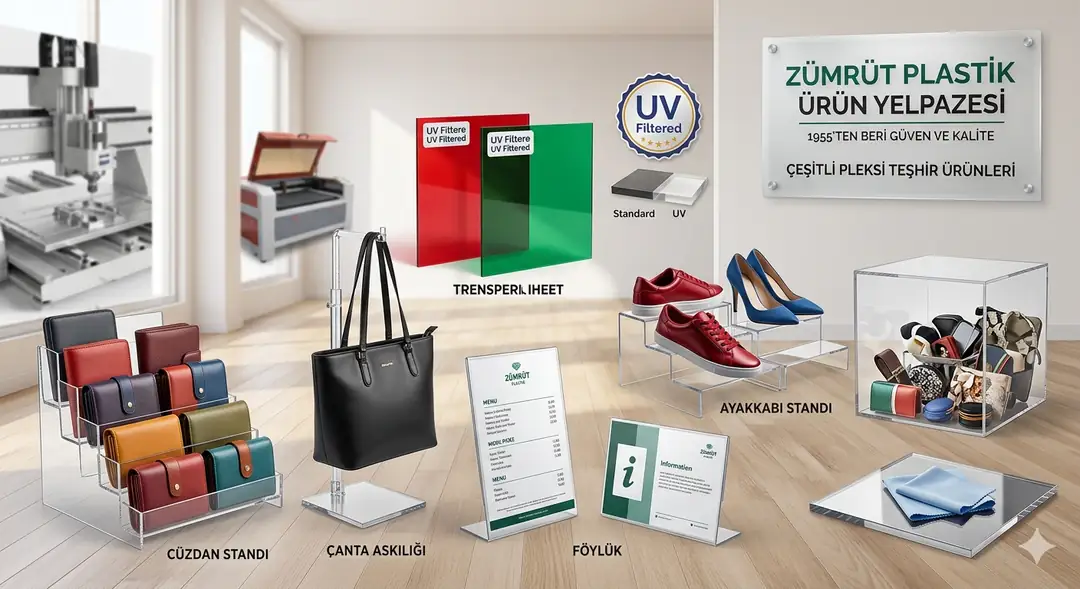 Görsel Placeholder Konumu[GÖRSEL-5: Alt text: "Zümrüt Plastik ürün yelpazesi, çeşitli pleksi teşhir ürünleri" | Önerilen içerik: Farklı pleksi ürünlerin (cüzdan standı, çanta askılığı, föylük, ayakkabı standı) bir arada gösterildiği ürün fotoğrafı montajı]