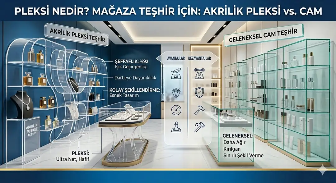 Mağaza teşhir malzemesi seçerken sık sık karşılaştırılan iki malzeme vardır: pleksi ve cam. Her iki malzeme de şeffaflık sunsa da, kullanım alanı, maliyet ve dayanıklılık açısından önemli farklar barındırır. İşte ayrıntılı karşılaştırma: