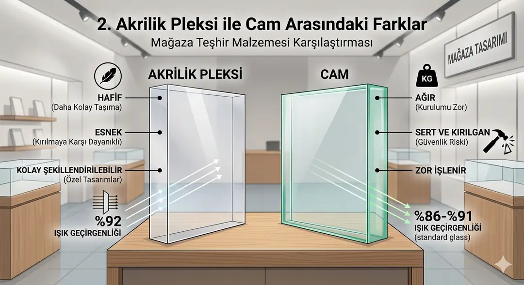 Ana Bulgu: Pleksi, mağaza teşhiri için daha ekonomik, güvenli ve işlenebilir bir seçenek sunarken, cam daha yüksek şeffaflık ve uzun ömür talebi olan lüks uygulamalar için tercih edilmektedir.