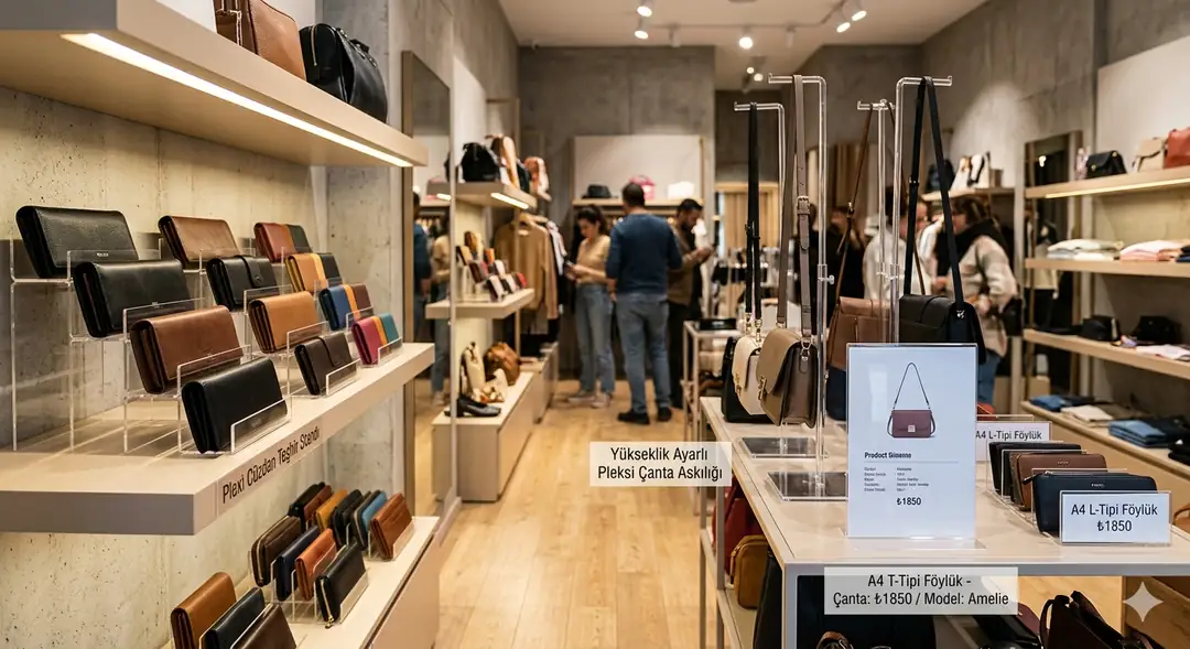 Görsel Placeholder Konumu[GÖRSEL-4: Alt text: "Mağaza vitrini pleksi teşhir standları kullanılarak dekore edilmiş" | Önerilen içerik: Cüzdan, çanta ve aksesuar standlarının ürün sunumunda kullanıldığı gerçek mağaza ortamı fotoğrafı]
